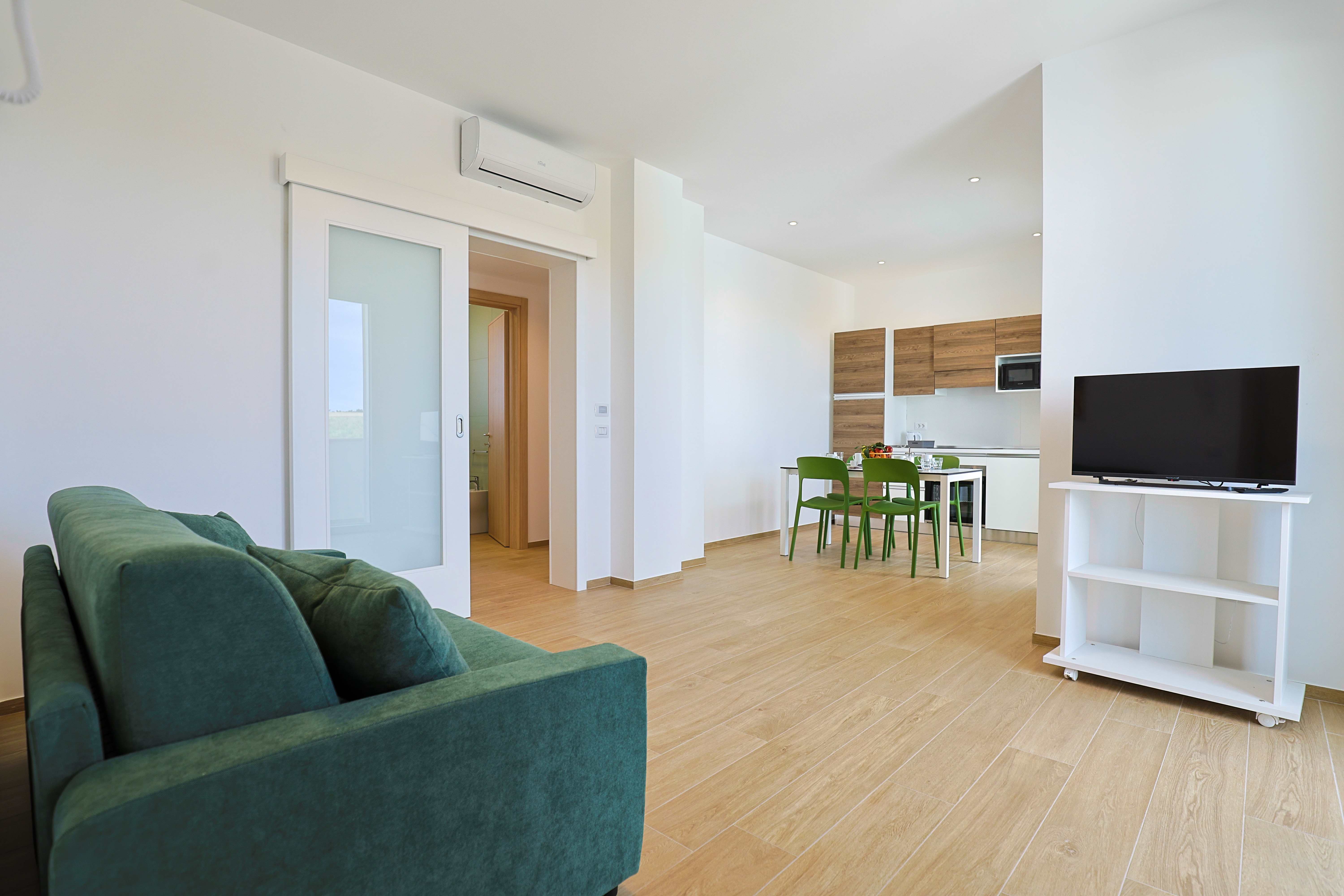 Appartamento completamente indipendente posto al piano primo, dotato di giardino di esclusiva pertinenza, due camere da letto (allestibili entrambe con due letti singoli oppure con due letti matrimoniali), un soggiorno con cucina e divano letto matrimoniale - per un totale di max sei posti letto - un bagno con doccia e un vano lavanderia.